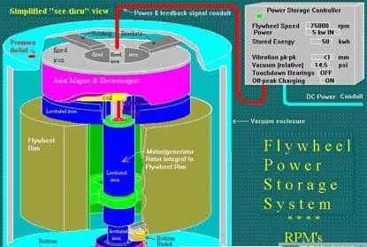 1994年,美國阿貢(ANL)國家實驗室用碳纖維試制一個儲能飛輪:直徑38厘米,質(zhì)量為 11千克,采用超導(dǎo)磁懸浮,飛輪線速度達(dá)1000米/秒。它儲的能量可將10個100瓦燈泡點燃2~5小時。該實驗室目前正在開發(fā)儲能為50千瓦小時的儲能輪,最終目標(biāo)是使其儲能達(dá)5000千瓦小時的儲能飛輪。一個發(fā)電功率為100萬千瓦的電廠,約需這樣的儲能輪200個。