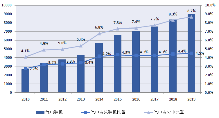 自2010年以來,氣電產(chǎn)業(yè)雖然經(jīng)歷了天然氣供應(yīng)階段性緊張、氣價上揚、電力需求增速放緩等不利因素的影響,但整體仍發(fā)展較快。圖2顯示,氣電裝機容量自2010年至今已增長240%。但由于同期風(fēng)電、光伏發(fā)電的迅猛發(fā)展,使得氣電在總裝機容量的比重增長并不明顯,特別近5年基本維持在4.3%~4.5%。但氣電在火電裝機的比重卻保持了較為明顯的增長態(tài)勢,由2010年的4.1%增長為2019年的8.7%,表明氣電作為低碳清潔能源在我國能源結(jié)構(gòu)調(diào)整和低碳轉(zhuǎn)型中地位越來越重要。