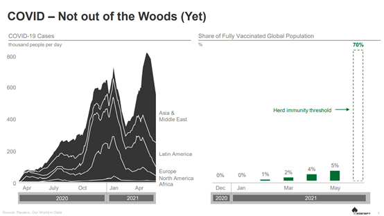 迄今為止,疫苗接種覆蓋了約5%的世界人口。即使不算重新接種,按照這樣的速度,也需要12-14個月才能為世界上70%的人口接種疫苗。整個地區都無法獲得疫苗,而且到目前為止,前景還很不明朗。因此,群體免疫的發生和危機的恢復將需要更長的時間。