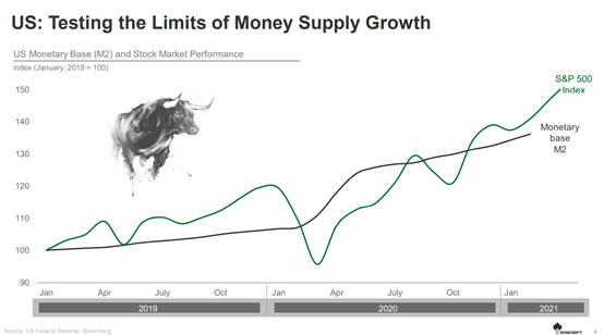 以美國的貨幣增長為例。美國政府采取的行動導致了2020年25%的貨幣增長,這種增長將在未來一年繼續下去。這些支持經濟的計劃,以及美聯邦儲備系統的量化寬松政策,對實體經濟復蘇的貢獻有限。