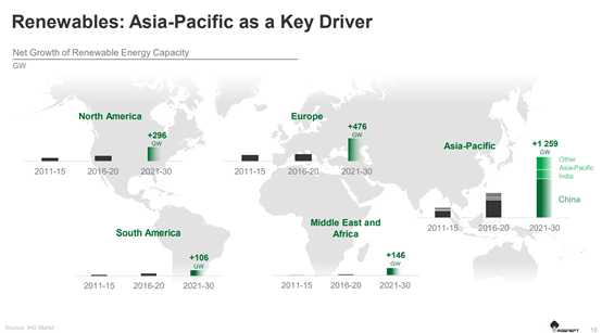 亞太地區成為可再生能源發展的火車頭,因為在過去的10年里,其可再生能源能力的增長比歐洲和美國高幾倍。據分析,這一趨勢將在未來10年內持續下去。因此,中國、印度和其他亞太國家的可再生能源產能投產范圍將超過歐洲的2.5倍以上。這將是一個平衡的增長,將與常規能源的發展同時進行。