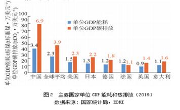 目前,我國(guó)單位GDP碳排放量是全球平均水平的1.8倍,單位GDP能耗是全球平均的1.5倍(如圖2所示)。如果我國(guó)能源利用效率能從3.4噸標(biāo)準(zhǔn)煤/萬(wàn)美元降到2.3噸標(biāo)準(zhǔn)煤/萬(wàn)美元,則可直接節(jié)約15億噸標(biāo)準(zhǔn)煤,減少碳排放約39億噸。可見(jiàn),未來(lái)我國(guó)節(jié)能提效仍具有很大的潛力與空間,我們必須堅(jiān)持貫徹落實(shí)節(jié)能優(yōu)先的方針,大力推進(jìn)能效提升,加快實(shí)現(xiàn)節(jié)約發(fā)展。
