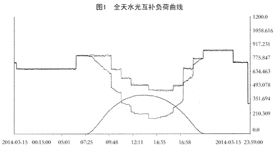 由圖1可見,光伏發(fā)電負(fù)荷曲線為水電廠負(fù)荷曲線全覆蓋,即光伏發(fā)電百分之百被利用,且水電與光伏互補(bǔ)后與全廠負(fù)荷曲線基本吻合,說明互補(bǔ)性能良好,電能質(zhì)量與輸出功率符合電網(wǎng)要求。