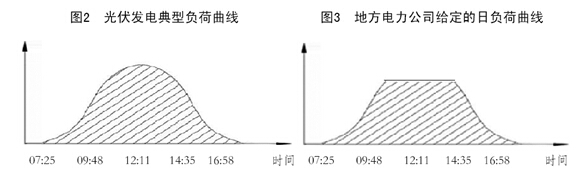 4.避免了直接并網(wǎng)的光伏電站“被”限電棄光。有的地方電力公司因種種原因,不能百分之百履行國家電網(wǎng)公司下發(fā)的文件中對(duì)光伏發(fā)電等新能源電量實(shí)行全額收購的承諾,往往對(duì)光伏發(fā)電站給定的日負(fù)荷曲線與光伏電站實(shí)際發(fā)電的日負(fù)荷曲線不同,實(shí)際上本身就是使光伏發(fā)電企業(yè)“被”限電棄光。因?yàn)楣夥l(fā)電的典型日負(fù)荷曲線的基本形狀為圖2所示,而有的地方電力公司給定的日負(fù)荷曲線為削去中午前后(一天光伏發(fā)電最好階段)的一定電量(如圖3),這不僅給光伏發(fā)電企業(yè)帶來了一定的經(jīng)濟(jì)損失,同時(shí)也浪費(fèi)了本應(yīng)合理利用的清潔能源資源。