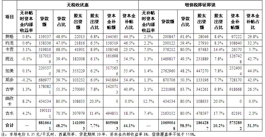 我們選取了發生可能性最高的市場電價0.31元/千瓦時、貸款期限30年、西藏利率情景,對同時滿足企業資本金內部收益率8%和銀行償債覆蓋率110%情況下,項目對國家資金部補貼的需求進行了測算。考慮到西藏水電開發意義重大,項目應可享受一定財稅優惠政策。當前,我國對鼓勵發展的核電行業項目給予了增值稅即征即退的優惠政策。我們在測算時,也考慮了增值稅返還政策的影響(詳見表3)。
