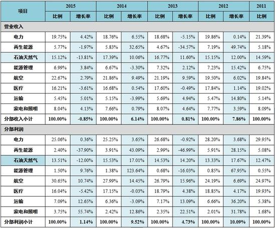 表1 2011-2015年通用電氣的營業收入和凈利潤構成及增長率