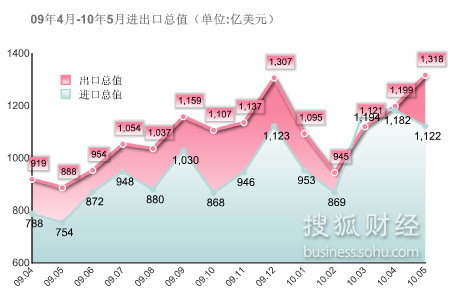 10日發布今年1至5月中國外貿進出口情況。統計顯示,5月份中國進出口值2439.9億美元,增長48.4%。其中出口1317.6億美元,增長...