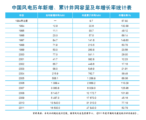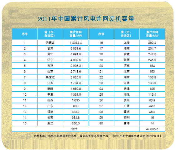 截止2011年底,全國累計裝機為62.36GW,并網容量47.84GW,并網率為76.7%。裝機、并網容量均居世界第一。
