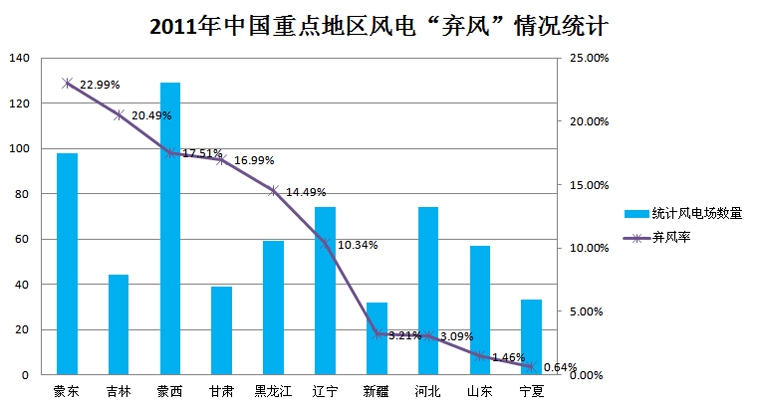 據不完全統計,2011年棄風超過100億KWh,棄風比例超過12%,棄風導致風電發電時間明顯減少:2011年,全國并網機組平均利用小時數為1903小時,比2010年少了144小時。