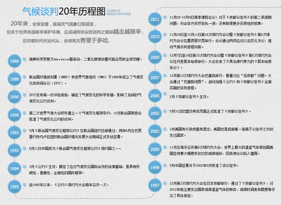 1:大會(huì)取得的最大成果是,最終就2013年起執(zhí)行《京都議定書(shū)》第二承諾期達(dá)成了一致;第二承諾期時(shí)限的5年和8年之爭(zhēng),最終以8年期限達(dá)成一致。