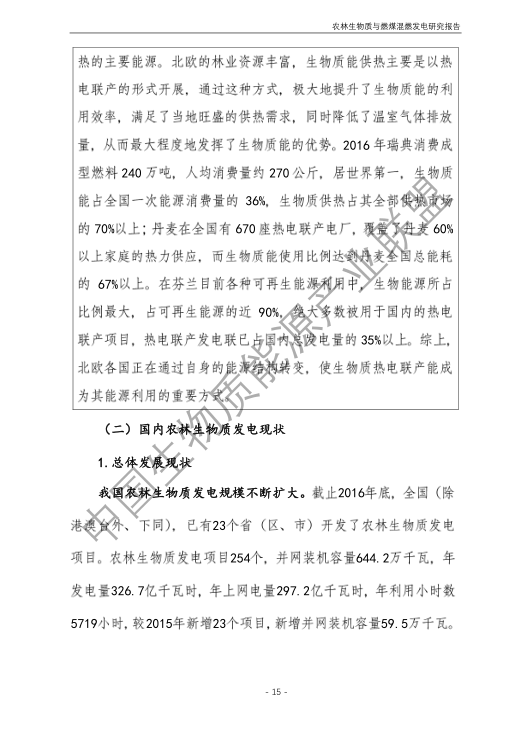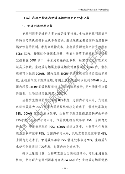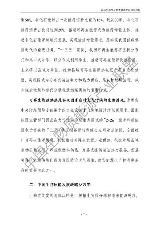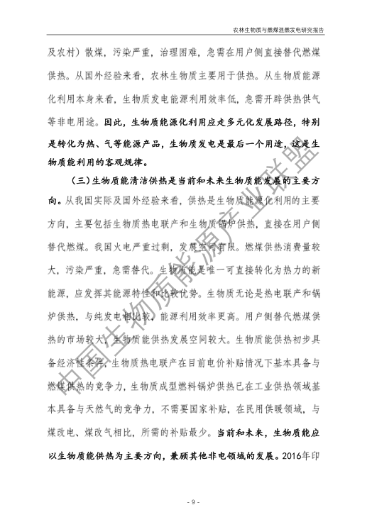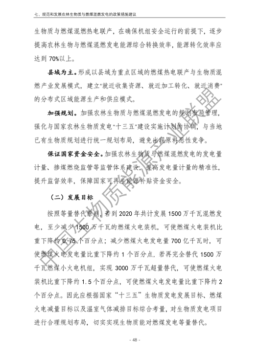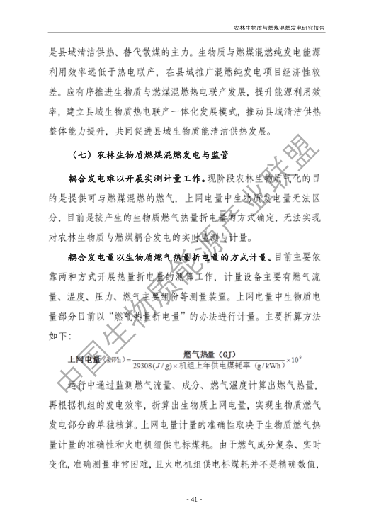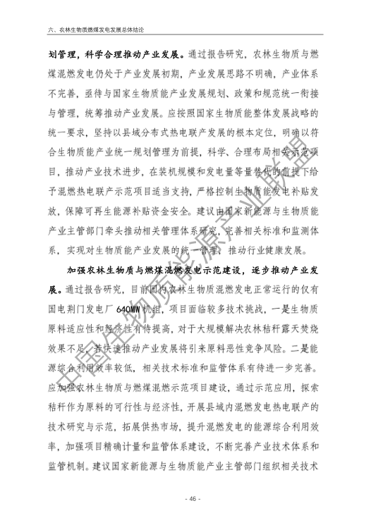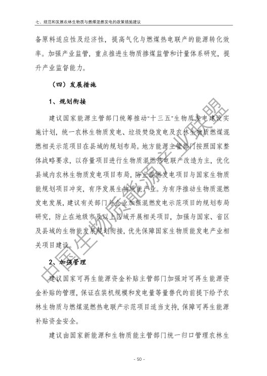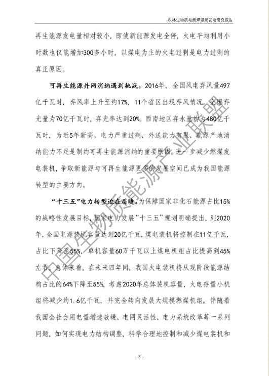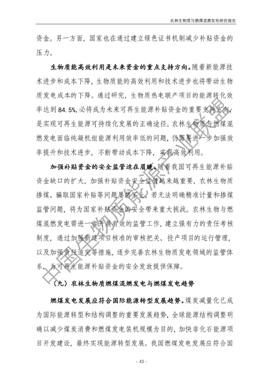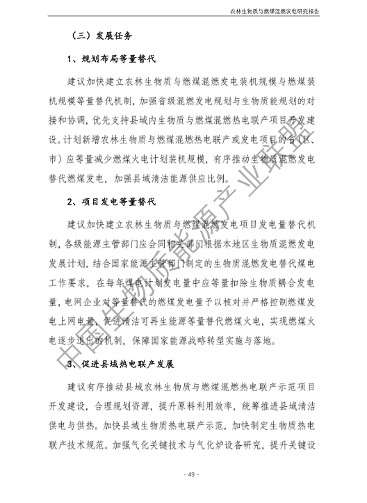 6.農林生物質與燃煤混燃發電應以最終去煤為目的,發揮等量替代作用,實現縣城熱電聯產發展,加強規劃布局和監督管理。報告提出農林生物質與燃煤混燃發電發展思路與實施路徑。一是糾正生物質發電量不占用煤電機組計劃電量、生物質發電容量不抵扣煤電機組額定發電容量”的發展原則,以替代煤炭為主要方向,實現混燃發電最終去煤化發展,規劃布局生物質混燃發電裝機應同等減少煤電裝機,并根據生物質發電量等量削減燃煤發電計劃。二是堅持以縣域分布式熱電聯產發展的根本定位,明確以符合生物質能產業統一規劃管理為前提,統籌規劃布局生物質發電項目和混燃發電示范項目,實現熱電聯產技術示范和應用。三是推動產業技術標準和監管體系建設,加強監督管理,防止以生物質混燃發電名義變相增加煤電機組利用小時數和燃煤發電量指標,切實落實烯煤發電量削減計劃。