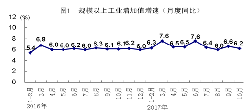 10月份,全國規模以上工業增加值同比實際增長6.2%,增速比上月回落0.4個百分點,比上年同月加快0.1個百分點。分經濟類型看,國有控股企業增加值同比增長6.6%,集體企業增長3.6%,股份制企業增長6.1%,外商及港澳臺商投資企業增長6.5%。分三大門類看,采礦業增加值同比下降1.3%,制造業增長6.7%,電力、熱力、燃氣及水生產和供應業增長9.2%。規模以上工業企業產銷率達到97.8%。1-10月份,全國規模以上工業增加值同比增長6.7%,增速與1-9月份持平,比上年同期加快0.7個百分點。