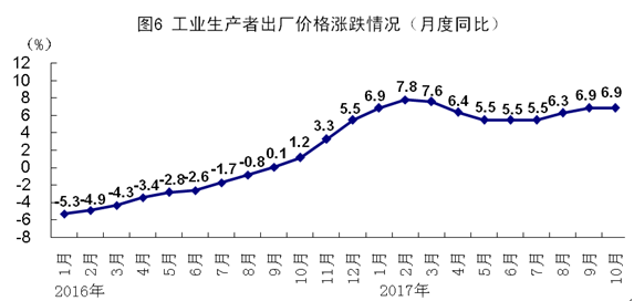 10月份,全國工業生產者出廠價格同比上漲6.9%,漲幅與上月持平,環比上漲0.7%。1-10月份,全國工業生產者出廠價格同比上漲6.5%。10月份,全國工業生產者購進價格同比上漲8.4%,環比上漲0.9%。1-10月份,全國工業生產者購進價格同比上漲8.4%。