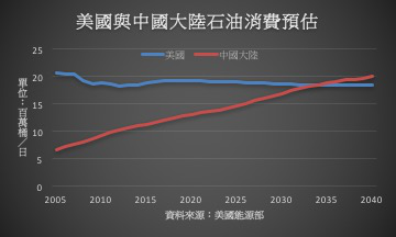 報告也預估,中國至2030年代初期將會超過美國成為全球最大的石油消費國,至2040年大陸石油需求預估將達到1,550萬桶/日。