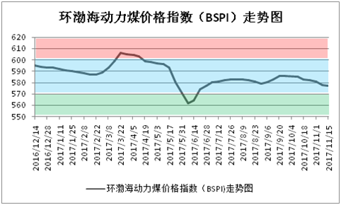 據秦皇島煤炭網11月15日發布的最新數據顯示,2017年11月8日至11月14日,環渤海動力煤價格指數報收于577元/噸,自9月底開始下跌后,已經累計下滑9元/噸,逐漸接近綠色正常區域(如圖所示)。