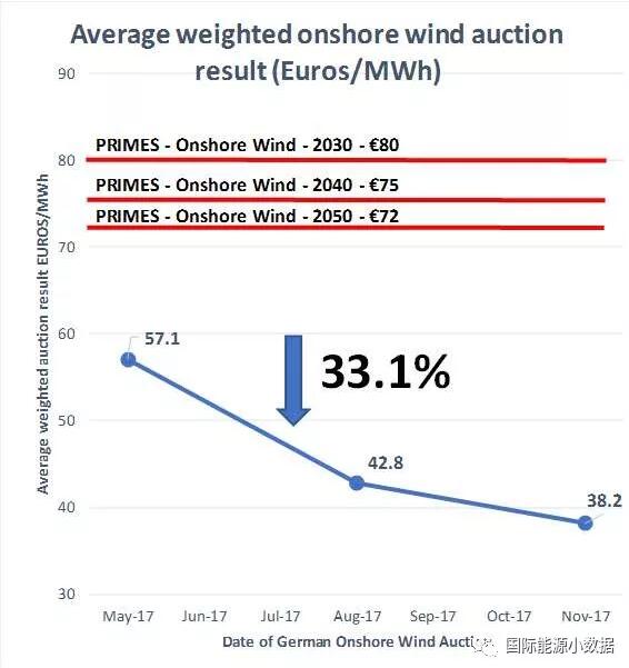 今年5月,德國第一輪陸上風電807兆瓦項目招標的中標企業平均報價為57.1歐元/兆瓦時;而在8月份第2輪的1吉瓦陸上風電招標中,中標企業的平均報價為42.8歐元/千瓦時。也就是說,德國陸上風電在過去6個月內成本下降了33%。