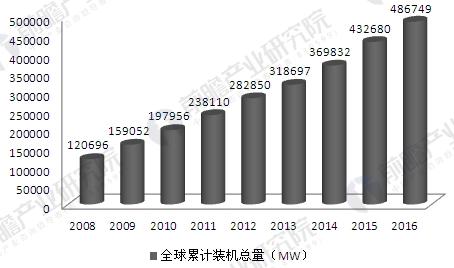 2008-2016年全球風(fēng)電累計(jì)裝機(jī)容量(單位:MW)