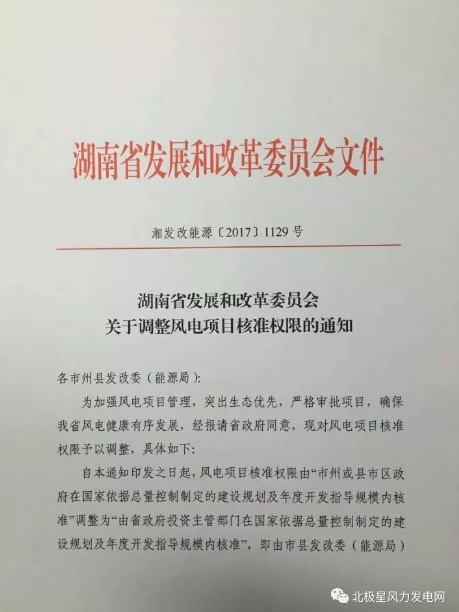 湖南省發(fā)改委調(diào)整風(fēng)電項(xiàng)目核準(zhǔn)權(quán)限:由市縣發(fā)改委核準(zhǔn)調(diào)整為省發(fā)改委(能源局)核準(zhǔn)