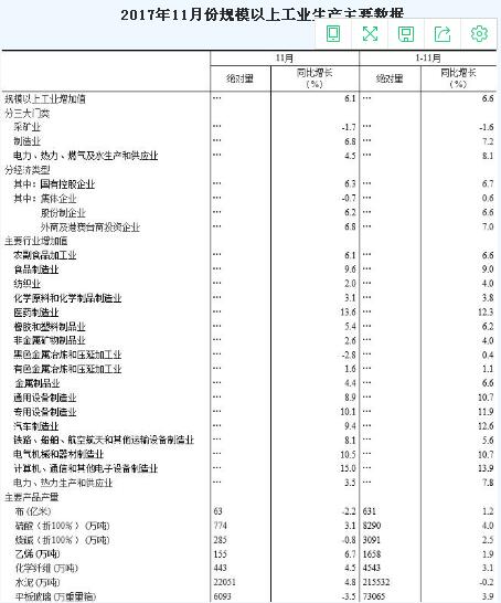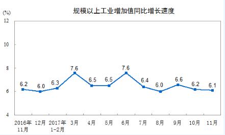 12月14日統計局發布數據,2017年11月份,規模以上工業增加值同比實際增長6.1%(以下增加值增速均為扣除價格因素的實際增長率),比10月份回落0.1個百分點。從環比看,11月份,規模以上工業增加值比上月增長0.48%。1-11月份,規模以上工業增加值同比增長6.6%。