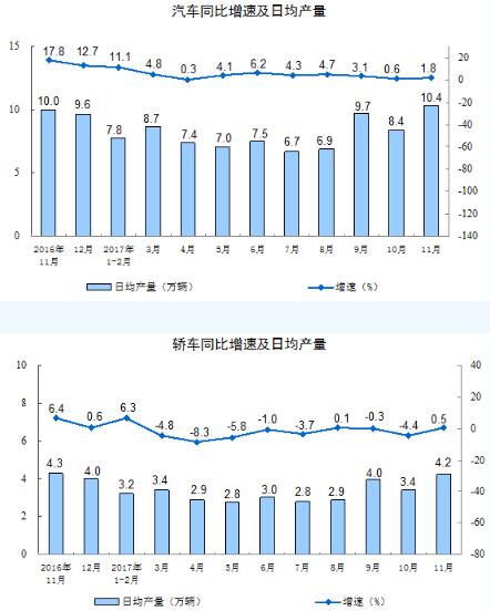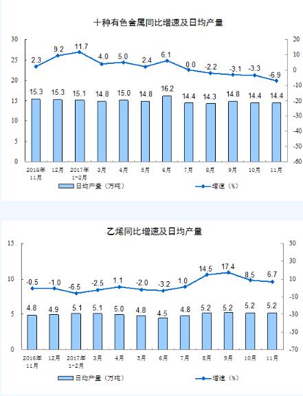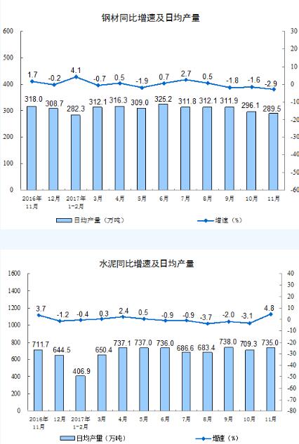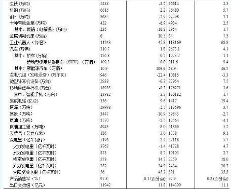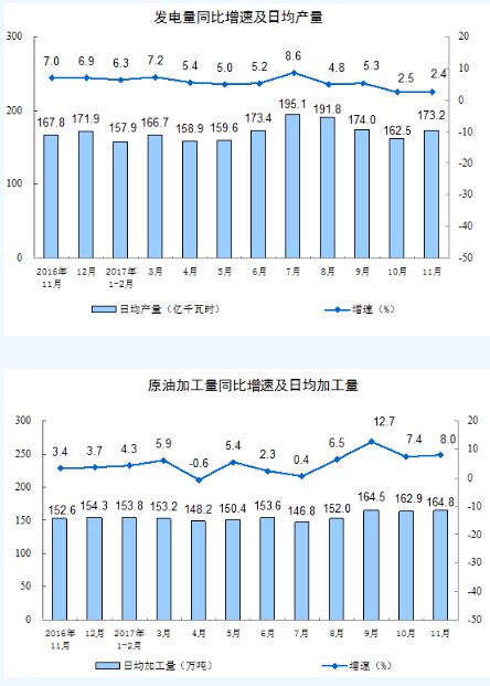 分產品看,11月份,596種產品中有318種產品同比增長。其中,鋼材8685萬噸,同比下降2.9%;水泥22051萬噸,增長4.8%;十種有色金屬432萬噸,下降6.9%;乙烯155萬噸,增長6.7%;汽車310.7萬輛,增長1.8%;轎車126.8萬輛,增長0.5%;發電量5196億千瓦時,增長2.4%;原油加工量4943萬噸,增長8.0%。