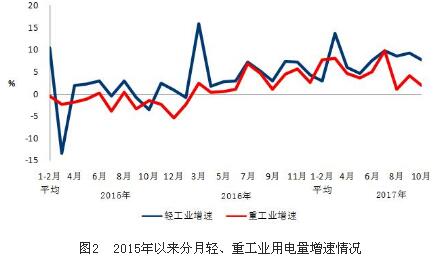 10月份,全國工業用電量3587億千瓦時,同比增長2.9%,占全社會用電量的比重為69.9%。其中,輕工業用電量628億千瓦時,同比增長7.7%,占全社會用電量的比重為12.2%;重工業用電量2958億千瓦時,同比增長1.9%,占全社會用電量的比重為57.7%。