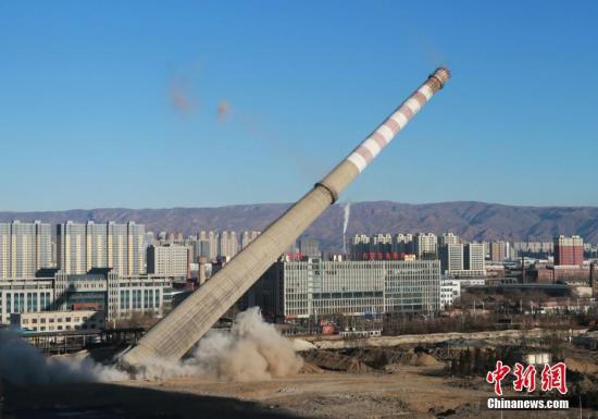 資料圖:老電廠淘汰“小火電”,爆破180米煙囪。中新社記者 尚虹波 攝