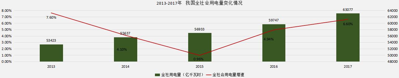 根據國家能源局公布2017年我國電力工業運行數據顯示,2017年,我國全社會用電量63077億千瓦時,同比增長6.6%。