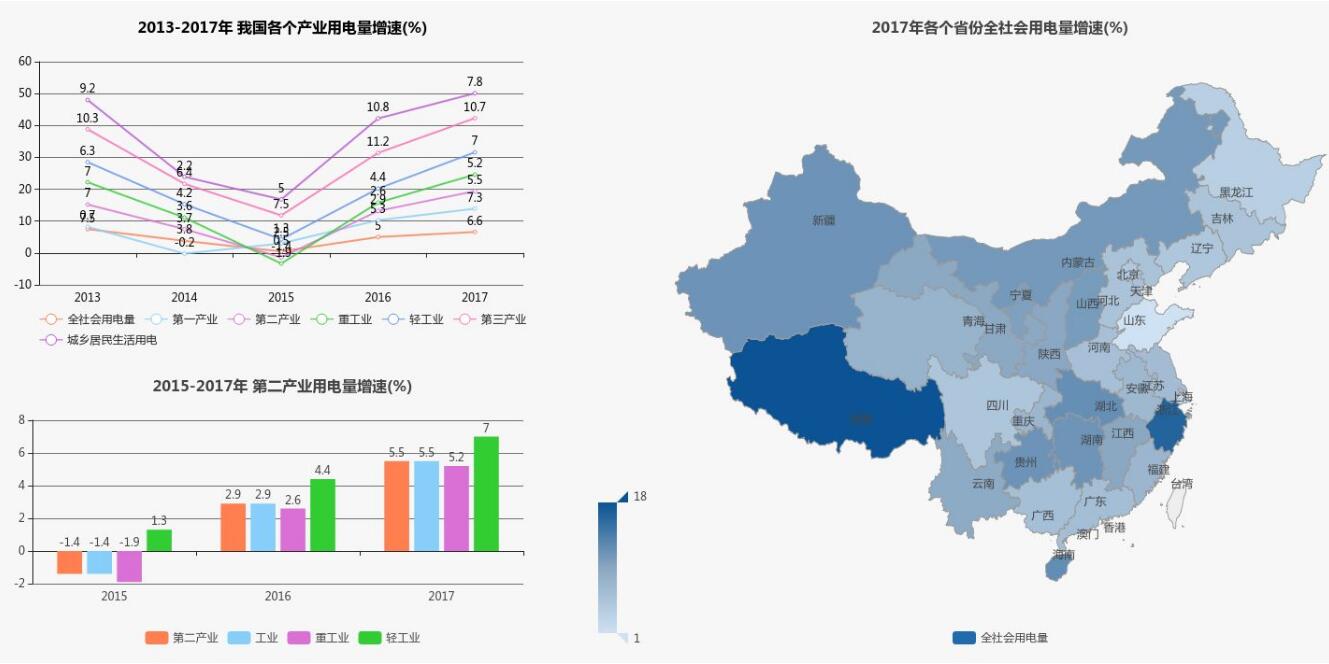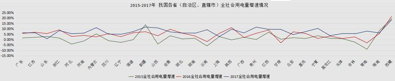 從全社會用電量增速上看,2017年,我國各個省(自治區、直轄市)全社會用電量已經出現全面增長的局面。
