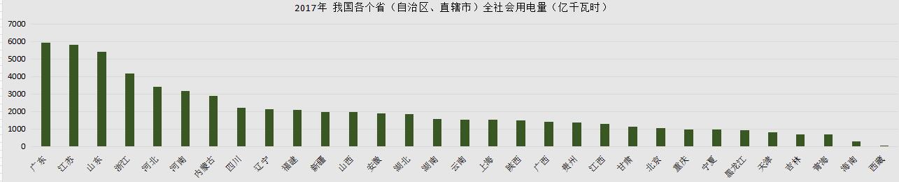 從全社會用電量總量上看,2017年,我國各個省(自治區、直轄市)全社會用電量東高西低的情況依然加劇。