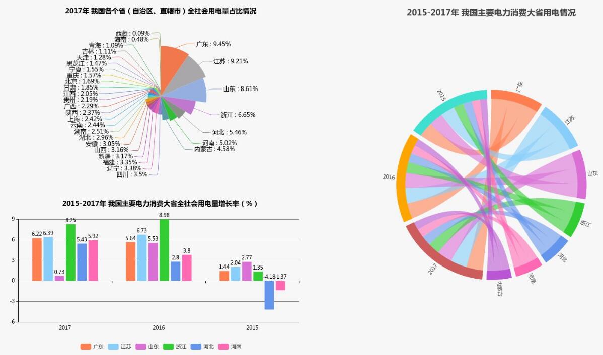 2017年,東部、南方地區依然是我國主要的經濟區,廣東、江蘇、山東、浙江GDP超過50000億元4個經濟大省,同時全社會用電量也居于全國前四位,四個省份綜合占我國全社會用電量的33.9%,與去年同期相比下降了0.1個百分點。