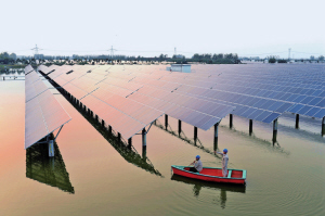 江蘇鹽城建湖縣供電公司員工到全國首個漁光互補光伏電站協(xié)助基地巡檢設(shè)備。肖兵 攝