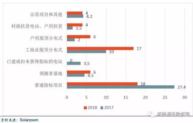 展望2018年,由于指標管理政策的嚴格,已建成但無法獲取指標的項目可能不再出現,因此我們認為需求端普通指標項目(普通集中式、集中式扶貧、地面分布式)會有所下降大約18GW;領跑者基地規模會進一步擴大,預計在6-8GW左右;分布式電站會延續高增長,預計有23-25GW;光伏扶貧力度將進一步增強,預計有4GW,示范電站和其他項目預計4-5GW,因此2018年國內裝機規模約為55-60GW,需求依然強勢。2017和2018年中國光伏新增裝機結構對比見下表(單位:GW)。