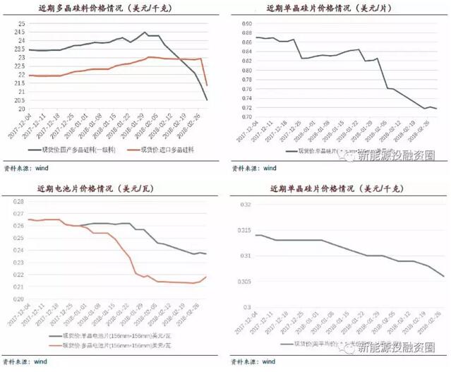 可以看到從2017年底開始,組件環節首先開始降價,此時產業其他環節價格還比較平穩,甚至多晶硅料環節還在漲價。進入2018年后組件售價依然緩慢下降,上游硅片出現斷崖式下跌,之后電池片環節開始大幅降價,進入2018年2月后,以隆基股份為代表的龍頭企業再次主動降價,同時硅料端開始大幅降價。產業鏈價格已經完成一輪相對完整的下跌周期,我們預計隨著二季度開始需求的好轉,各個產業環節價格開始企穩。