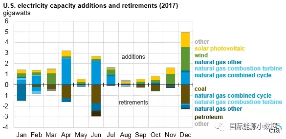 2017年有6.3吉瓦煤電裝機(jī)退役,而且全年沒有任何一座新的煤電廠投運(yùn),2017年末煤電總裝機(jī)為260.3吉瓦。這一年盡管也有4.0吉瓦的天然氣發(fā)電裝機(jī)退役,但是新增天然氣裝機(jī)9.3吉瓦(其中8.2吉瓦為聯(lián)合循環(huán)機(jī)組),年末總裝機(jī)為452.8吉瓦。