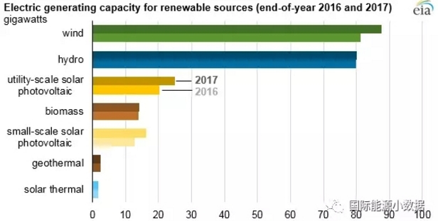在天然氣、煤電雙雙下降的同時(shí),風(fēng)電、光伏繼續(xù)大幅增長(zhǎng)。2017年新增風(fēng)電裝機(jī)6.3吉瓦,累計(jì)總裝機(jī)87.5吉瓦;2017年風(fēng)電達(dá)2542.5萬億千瓦時(shí)(占比6.3%),比2016年增長(zhǎng)12%。2017年新增大型太陽能光伏裝機(jī)4.7吉瓦,累計(jì)總裝機(jī)26.7吉瓦;大型太陽能發(fā)電529.6萬億千瓦時(shí)(占比1.3%),比2016年增長(zhǎng)46.9%。