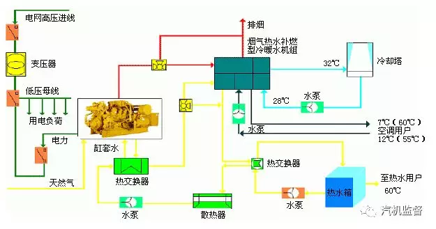 燃氣內燃機排煙余熱或用來制熱,或用來制冷,具體主要根據用戶需要來設計。制熱的話,一般選用余熱鍋爐,可以提供高溫高壓的蒸汽,也可以提供生活用熱水;制冷的話,一般選用溴化鋰制冷機。