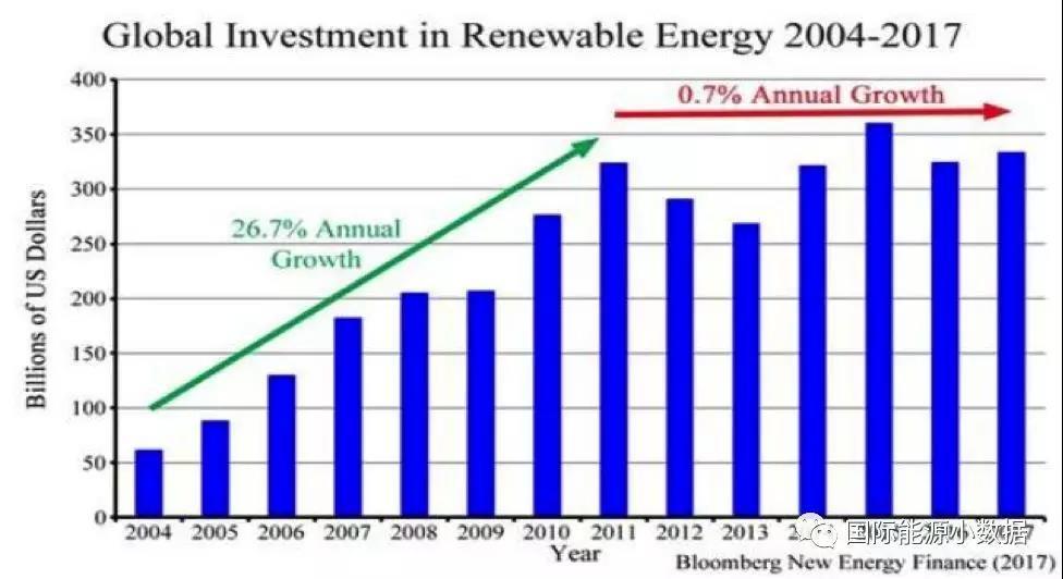 根據(jù)彭博新能源財經(jīng)的數(shù)字,2004年到2011年間全球可再生能源投資年增長率為26.7%。然而,2011年到2017年間全球可再生能源投資增長率僅為0.7%。2017年日本可再生能源投資下降16%、印度下降20%、德國下降26%、英國下降56%。美國小幅增長1%,而中國大增30%(1330億美元)。可以說,如果不是因為中國的巨大貢獻,全球的可再生能源投資其實是在下降的。