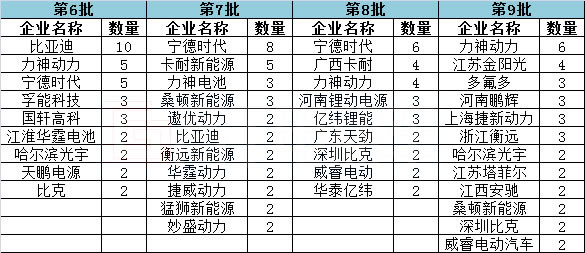 每批目錄中配套車型數量較多的電池企業