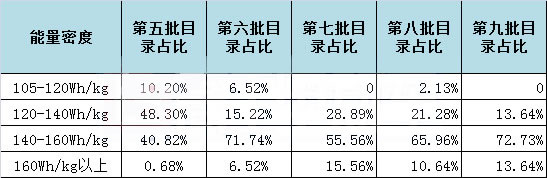 而在近幾批推薦目錄中,眾車企繼續發力高額補貼,能量密度160Wh/kg以上的車型逐漸增多,由第五批推薦目錄的0.68%,提升至了15.56%。在第7批到第9批目錄中,能量密度在160Wh/kg以上的車型占比均維持在10%以上,這些車型均可以拿到1.2倍補貼。