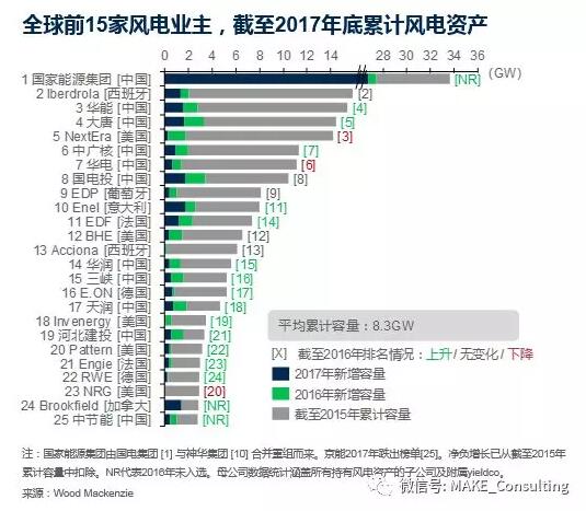 Wood Mackenzie電力與可再生能源事業(yè)部(以下簡稱WoodMac)近期發(fā)布《2018年全球風電資產(chǎn)所有權報告》。報告顯示,根據(jù)截至2017年底累計風電裝機容量排名的全球前25家風電業(yè)主中,11家持有風電資產(chǎn)的中國業(yè)主躋身榜單,其中由國電集團與神華集團合并重組后的國家能源集團以34GW累積風電資產(chǎn)傲居榜首。