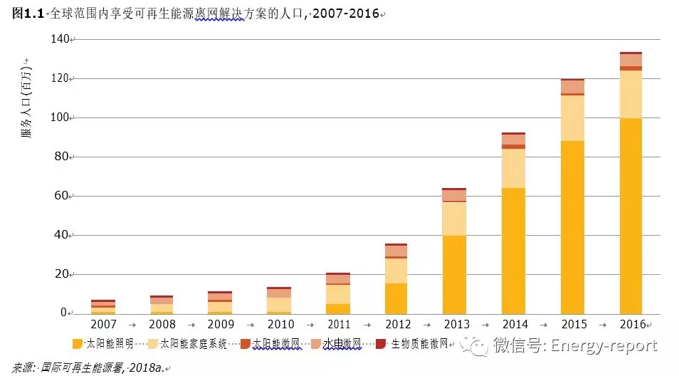成本大幅降低,技術進步和相關支持政策的出臺推動了全球范圍內離網可再生能源技術的應用? 據國際可再生能源署統計,2016年全球約有1.33億人口享受離網技術提供的服務,至少900萬人口接入到可再生能源微電網中,1.24億人口使用太陽能照明解決方案和太陽能家庭系統?(圖 1.1)