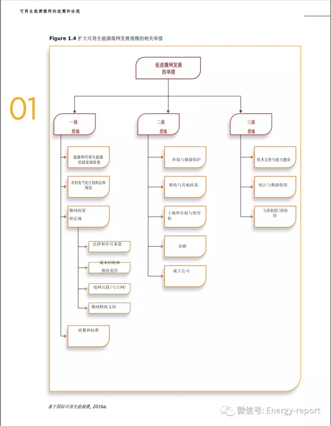 1.一級措施與國家能源框架有著內在的聯系,并且仍然屬于能源事務部門授權的公共機構的職權范圍,例如能源部? 其中包括與電力部門相關的政策和法規,農村電氣化計劃,監管框架,質量標準以及為微電網項目提供的直接財政支持?