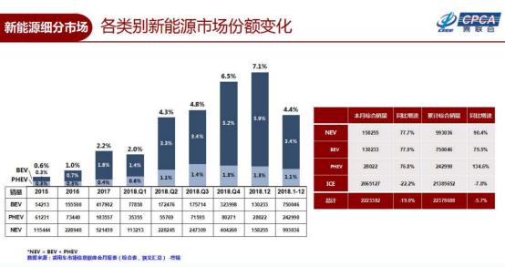 據(jù)乘聯(lián)會數(shù)據(jù)顯示,2018年,國內(nèi)新能源乘用車銷量為99.30萬輛,比上年同期增長90.4%。而乘聯(lián)會統(tǒng)計的是零售數(shù)據(jù),如果按批售量來算,在2018年,國內(nèi)新能源乘用車的銷量已經(jīng)突破了百萬,如果算上新能源商用車的銷量,國內(nèi)新能源汽車的體量已經(jīng)達到了年銷120萬輛的水平,并保持了相當高的增速。這對于中國汽車工業(yè)來說,是里程碑的一刻。