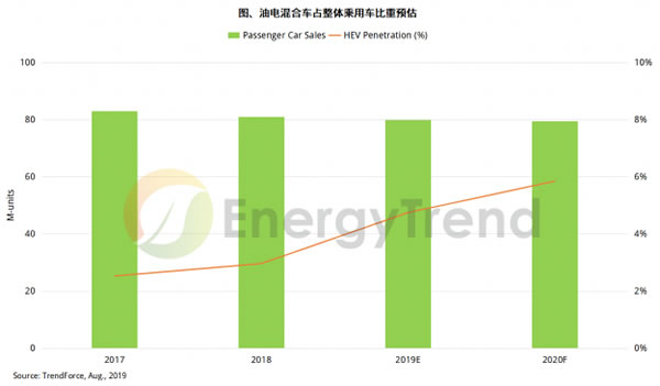 受惠于中國新版新能源車積分制度以及歐、美、日等市場規(guī)模擴大,油電混合動力車的市場商機備受關(guān)注。集邦咨詢旗下新能源研究中心集邦新能源網(wǎng)EnergyTrend預估,2019年全球油電混合車市占將達5%,相較之下,全球純電動乘用車僅2%。