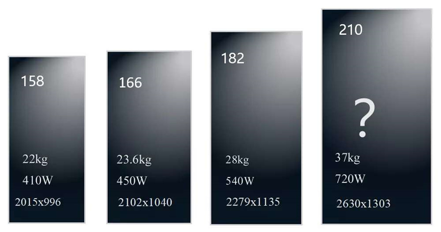 210=大組件么?經歷了一年多的硅片尺寸升級,光伏組件的功率隨著硅片尺寸的增大迅速提高。就像下圖展示,硅片尺寸從156到182(邊長mm),如果組件版型相同,大硅片就等于大組件,應用了182硅片的72版型組件功率最高已經達到540W。