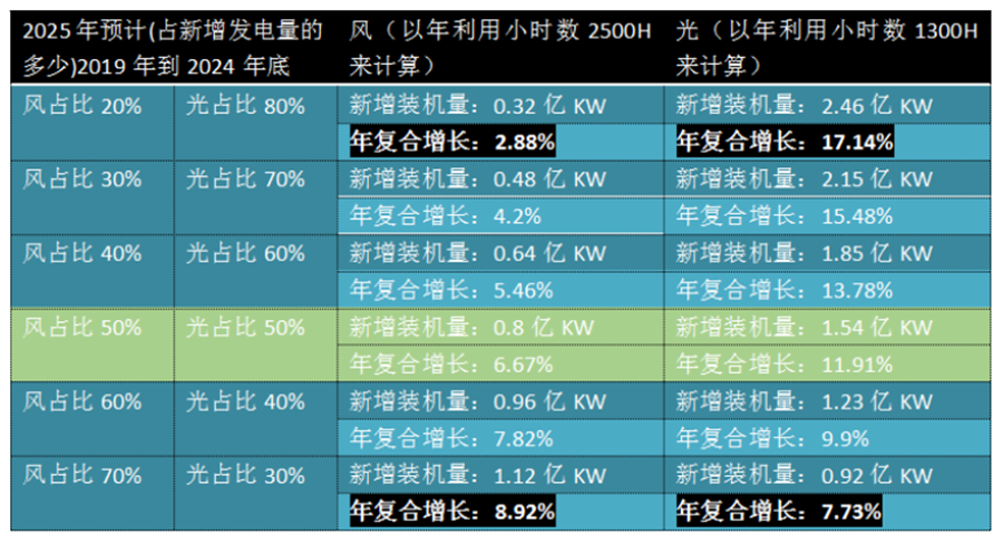 非化石能源中水電占比一直相對穩定,我們假設2025年水電占比為19%,也就是說,風電+光伏+核電+生物質總發電量占比18%,目前核電與生物質占比總量在6%左右,我們相對較保守預測風電和光伏未來發電量的占比為10%,也就是兩者合計發電量為0.95萬億千瓦時,新增發電量為4000億千瓦時。