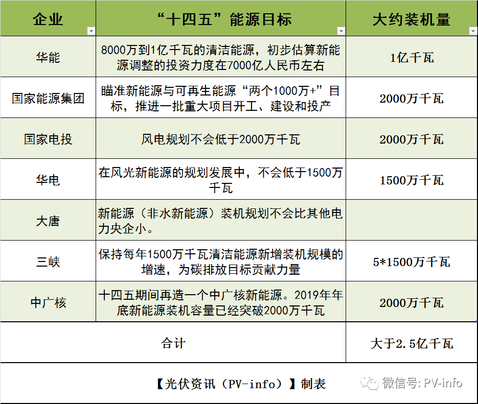 近日【光伏資訊】微信公眾號(PV-info)了解到,碳中和的目標自發布以來,各大電力央企紛紛發聲,規劃“十四五”能源目標,現光伏資訊進行整理匯總: