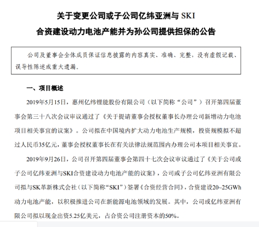 2019年9月26日,億緯鋰能董事會(huì)通過議案,公司或子公司億緯亞洲有限公司擬與SKI簽署《合資經(jīng)營合同》,合資建設(shè)20~25GWh動(dòng)力電池產(chǎn)能,以積極推進(jìn)公司在新能源電池領(lǐng)域的發(fā)展。其中,公司或億緯亞洲有限公司擬以現(xiàn)金出資5.25億美元,占合資公司注冊資本的50%。