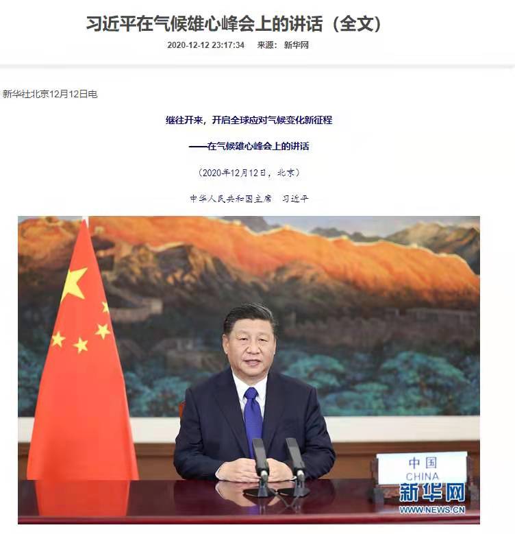 2020年12月12日23:17,新華網(wǎng)發(fā)布“繼往開來,開啟全球應(yīng)對氣候變化新征程——在氣候雄心峰會上的講話”。我國提出:到2030年,中國單位國內(nèi)生產(chǎn)總值二氧化碳排放將比2005年下降65%以上,非化石能源占一次能源消費比重將達到25%左右,森林蓄積量將比2005年增加60億立方米,風(fēng)電、太陽能發(fā)電總裝機容量將達到12億千瓦以上。