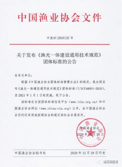 12月28日,由通威新能源公司編制的中國漁業協會團體標準——《漁光一體建設通用技術規范》通過評審公示并公布,將于2021年1月1日正式實施。該標準將在全國團體標準信息平臺(www.ttbz.org.cn)和中國漁業協會網站(www.china-cfa.org)公開。